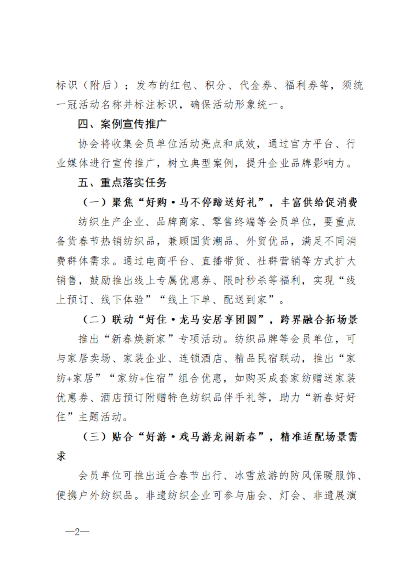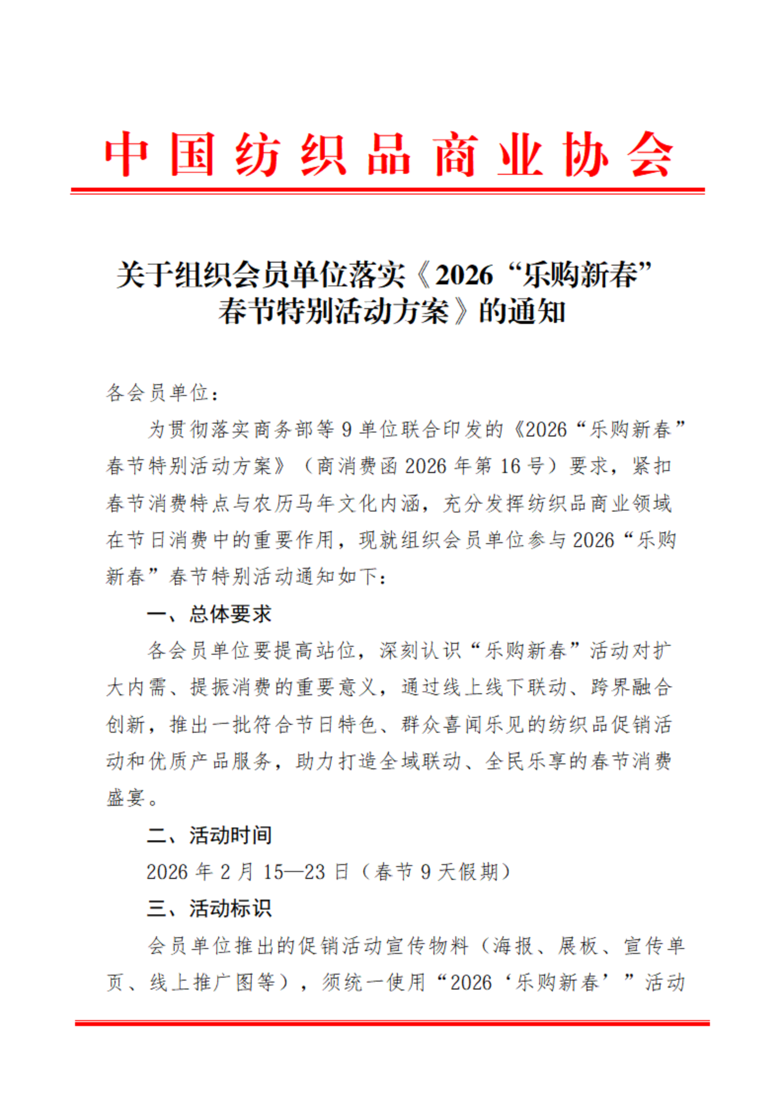 为贯彻落实商务部等9单位联合印发的《2026“乐购新春”春节特别活动方案》(商消费函2026年第16号)要求,紧扣春节消费特点与农历马年文化内涵,充分发挥纺织品商业领域在节日消费中的重要作用,现就组织会员单位参与2026“乐购新春”春节特别活动通知如下: